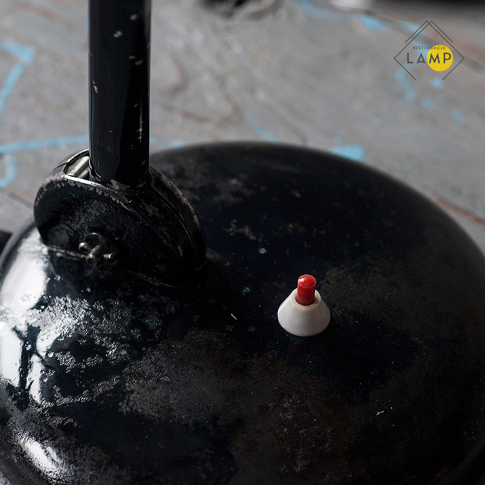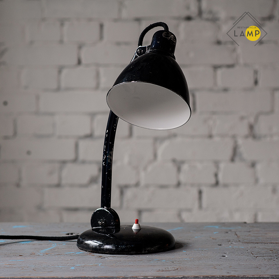 Czarna lampka biurkowa o bardzo prostej konstrukcji. Prawdopodobnie pochodzi z niemiec z lat 50-tych ubiegłego wieku. Sztywne ramię w kształcie łuku przymocowane jest do podstawy za pośrednictwem półokrągłego uchwytu. Klosz przymocowany jest do ramienia za pomocą śruby motylkowej. Kąt ustawienia klosza można regulować w jednej płaszczyźnie zmieniając tym samym powierzchnię oświetlanego obszaru. Farba na powierzchni wszystkich elementów lampy posiada przebarwienia i zadrapania. Postanowiliśmy tego nie zmieniać i w ramach renowacji cała powierzchnia zewnętrzna została oczyszczona i zabezpieczona bezbarwnym lakierem. Na środku stosunkową ciężkiej podstawy znajduje się włącznik/wyłącznik w kolorze biało czerwonym. Klosz od wewnątrz pomalowany jest na biało. Kabel i wtyczka zostały wymienione na stylowe zamienniki. Lampka doskonale się zaprezentuje się na starym biurku lub szafce.Kabel i wtyczka