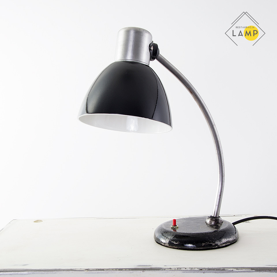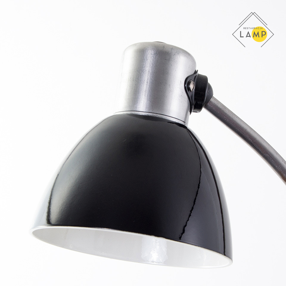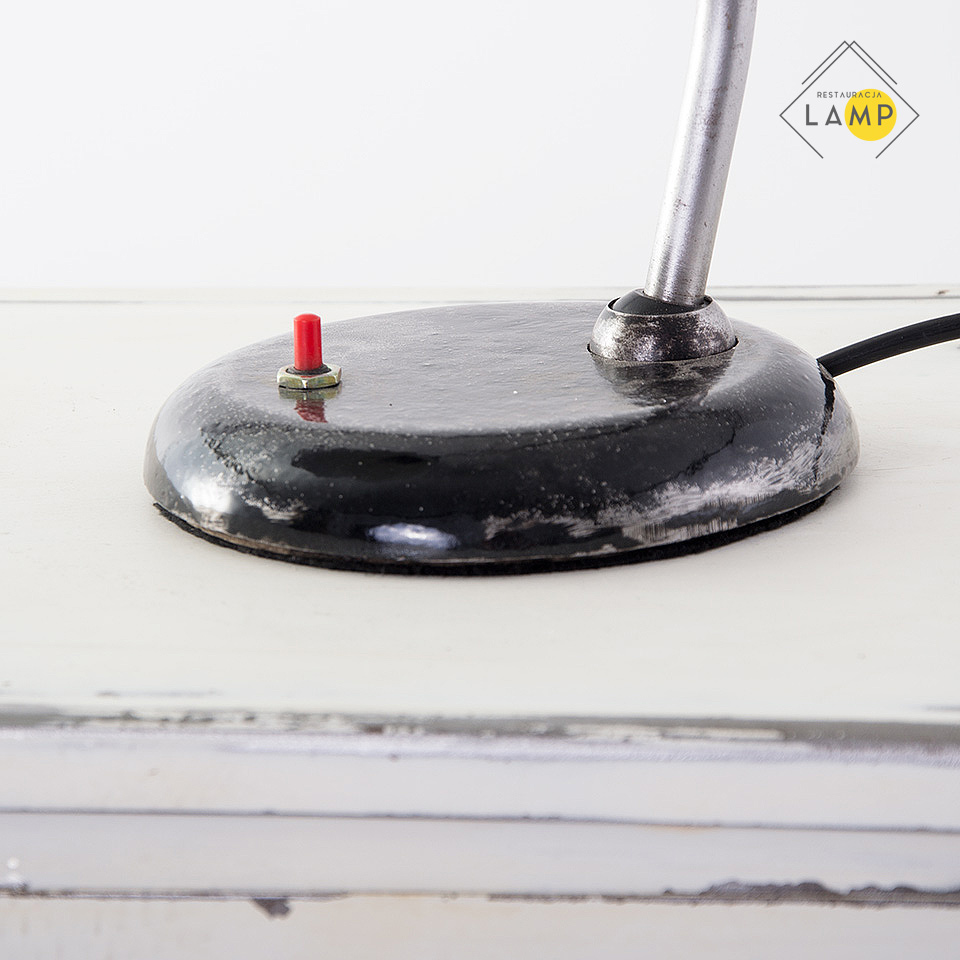 Lampka biurkowa z lat 50-tych ze sztywnym, wygiętym w łuk ramieniem z obu stron zakończonym metalowymi kulkami. Taki rodzaj mocowania elementów umożliwia regulację kąta ustawienia klosza względem ramienia podstawy oraz ramienia względem podstawy w wielopłaszczyznowym zakresie.