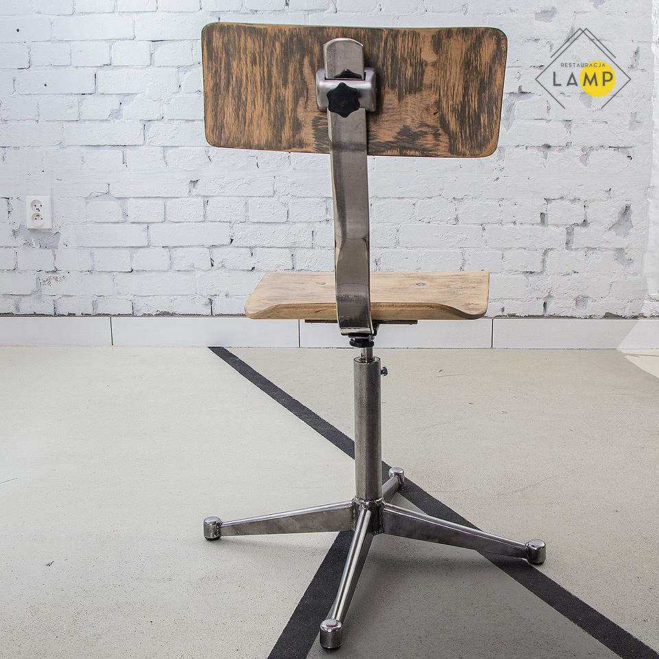 Krzesło obrotowe posiadające możliwość regulacji wysokości wyprodukowane została w Spółdzielni Pracy Precyzja w Bydgoszczy w 1972 roku. Z racji tego że (my- Restauracja Lamp) żyjemy, działamy i tworzymy w Bydgoszczy traktujemy te krzesła wyjątkowa wyjątkowo. Jest ich ponad 20 sztuk w naszym magazynie. Poszczególne egzemplarze różnią się one pewnymi detalami takimi intensywność postarzenia elementów drewnianych i nieregularne wzory na drewnie, ale mogą stanowić komplet przy jednym stole.