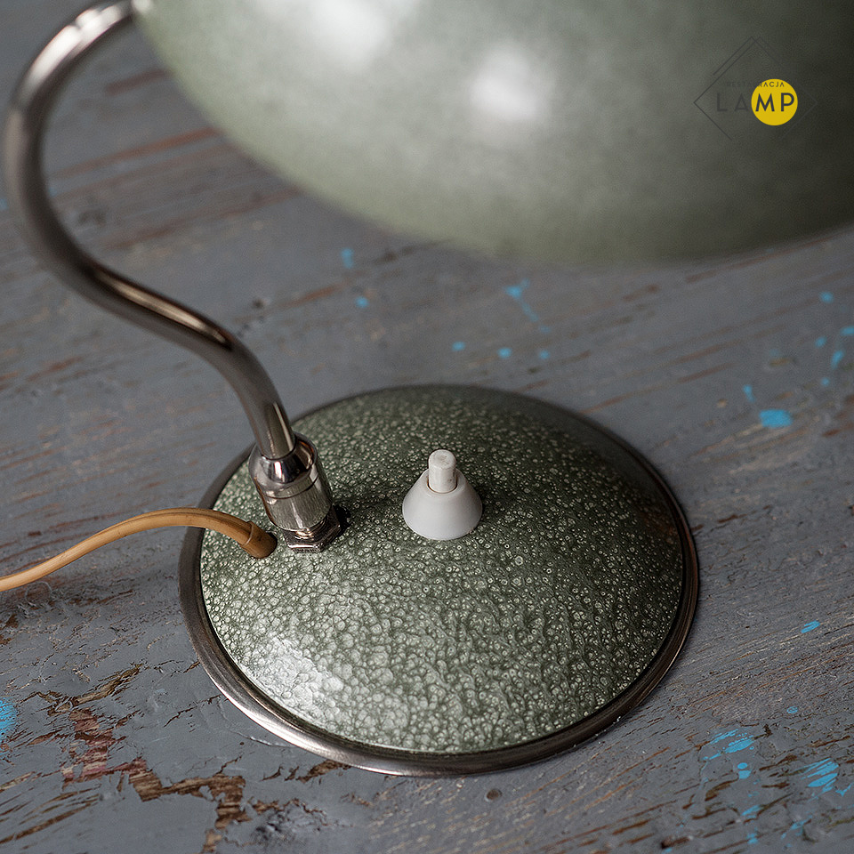 Lampa biurkowa mala stylem nawiązująca do lat 70-tych. Niestety nie udało nam się uzyskać zbyt wiele informacji na temat tego modelu, który jest bardzo praktyczny ze względu na małe rozmiary. Klosza umiejscowiony jest na sztywnym chromowanym ramieniu. Cała konstrukcja wykonana jest z metalu, a . Powierzchni klosza i podstawy pomalowana została na kolor jasno zielony z charakterystyczną fakturą na powierzchni. Na środku podstawy znajduje się biały włącznik. W przeciwieństwie do zewnętrznej części klosza powierzchnia wewnątrz klosza jest biała i gładka. W lampce zachował się oryginalny przewód, a wtyczka została wymieniona na stylow zamiennik. Cała powierzchnia została dokładnie oczyszczona.