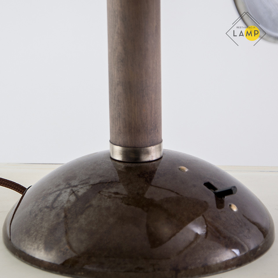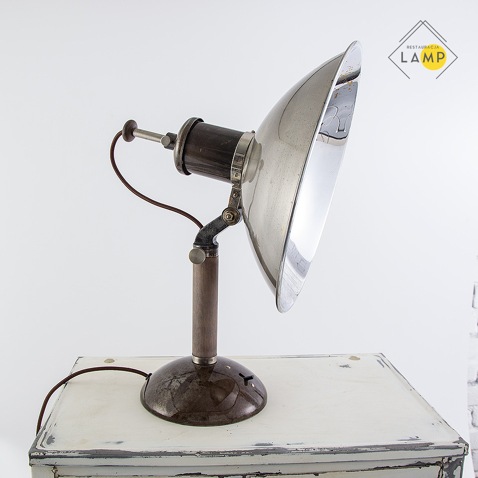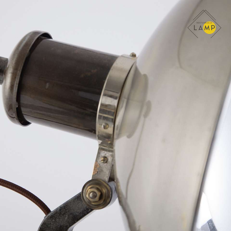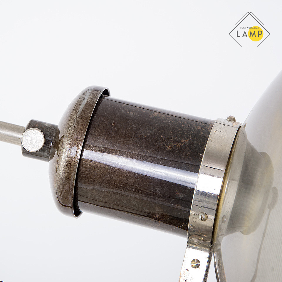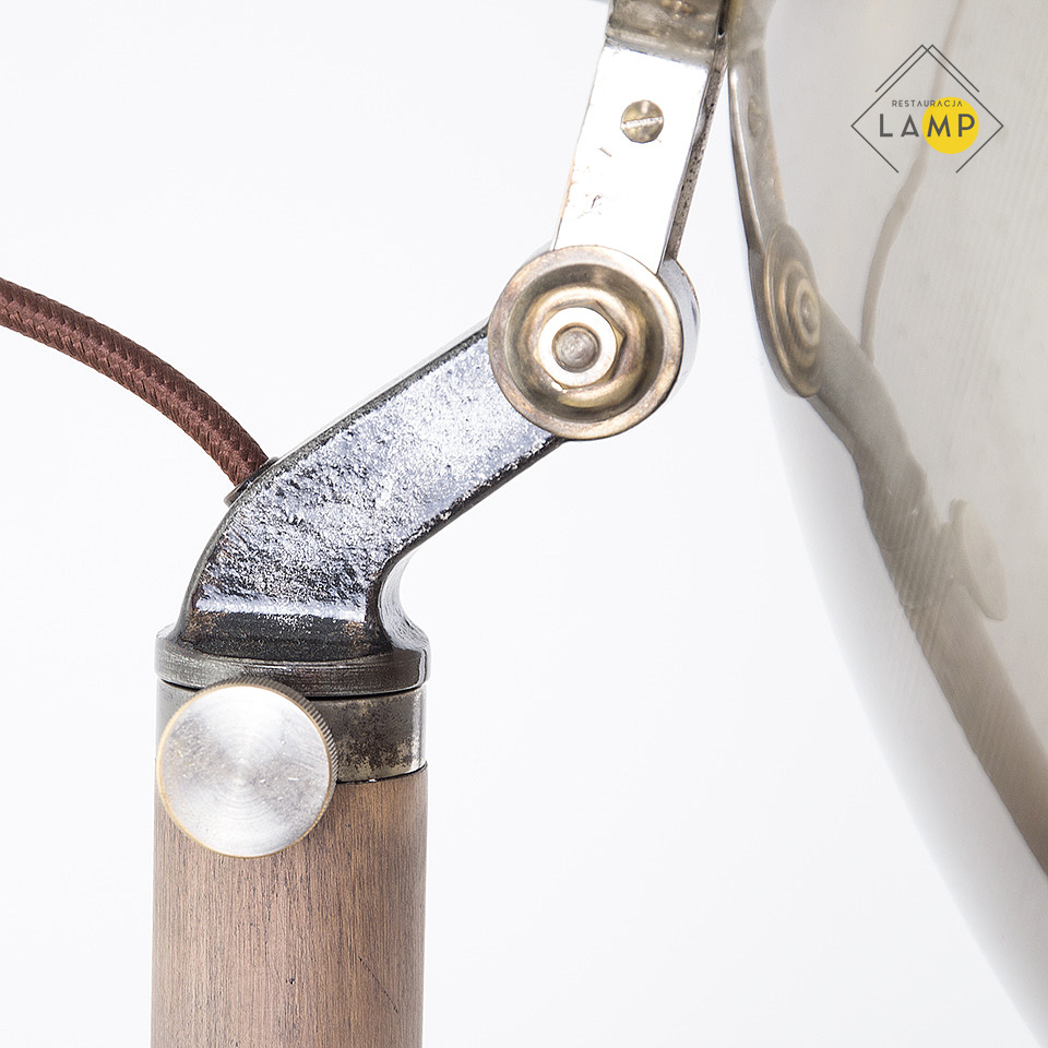 Obecnie lampa przystosowana jest do oświetlania zarówno jako kinkiet jak i lampa stojąca. Można regulować zasięg światła ręcznie od zewnętrznej strony klosza. Po ustawieniu głębokości na jakiej chcemy aby znalazła się oprawka — specjalna śruba dociskowa służy do zablokowania drążka, do którego przymocowana jest oprawka. Dodatkowo lampa ta jest regulowana w dwóch płaszczyznach. Można zmieniać długość ramienia oraz kąt ustawienia klosza. Drewniany element został zabezpieczony białym woskiem, natomiast pozostałe zostały oczyszczone i pomalowane bezbarwnym połyskowym lakierem. Klosz od wewnętrznej został wypolerowany a na powłoce chromowej są niewielkimi ślady rdzy, które nadają charakteru lampie. Włącznik znajduje się na podstawie lampy i na szczęście zachował się oryginalny i pracuje bardzo płynnie . Kabel który wychodzi za kloszem można lekko schować do środka ramienia lampy. Według mojej subiektywnej oceny stylem nawiązuje do idei propagowanych przez wajmarski Bauhaus.