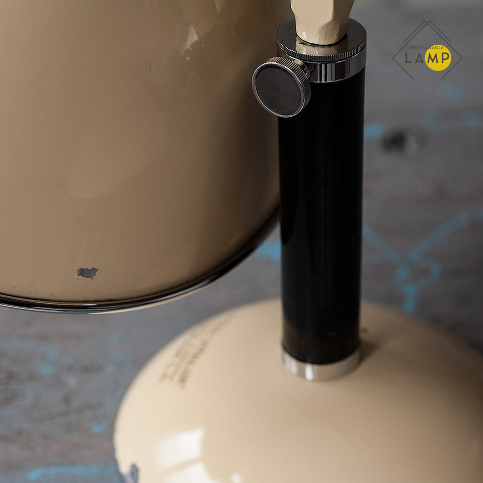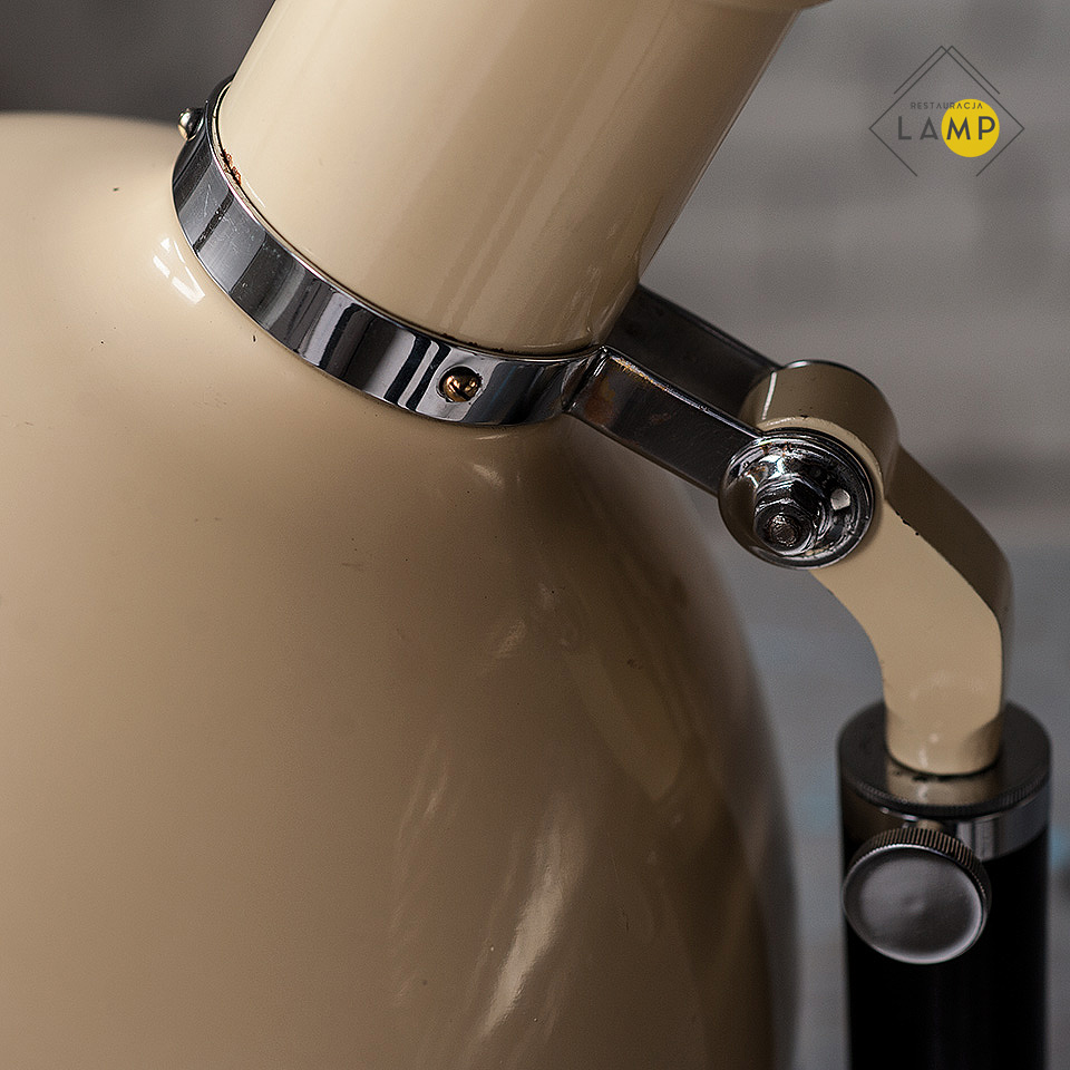 Obecnie lampa przystosowana jest do oświetlania zarówno jako kinkiet jak i lampa stojąca. Na dole podstawy posiada otwór służący do zamocowania jej na ścianie. Za pomocą ruchomej oprawki można regulować zasięg światła ręcznie od zewnętrznej strony klosza. Po ustawieniu głębokości na jakiej chcemy aby znalazła się oprawka, specjalna śruba kontrująca służy do zablokowania drążka, do którego przymocowana jest oprawka. Dodatkowo lampa ta jest regulowana w dwóch płaszczyznach. Można zmieniać długość ramienia oraz kąt ustawienia klosza. Drewniane ramię lampy jest w kolorze czarnym, natomiast pozostałe elementy pomalowane są na jasną żółć. Na widocznej części podstawy zachowała się nazwa modelu i producenta. Klosz od wewnętrznej został wypolerowany a na powłoce chromowej są niewielkimi ślady rdzy, które nadają charakteru lampie. Kabel wychodzi z drążka regulującego głębokość żarówki.