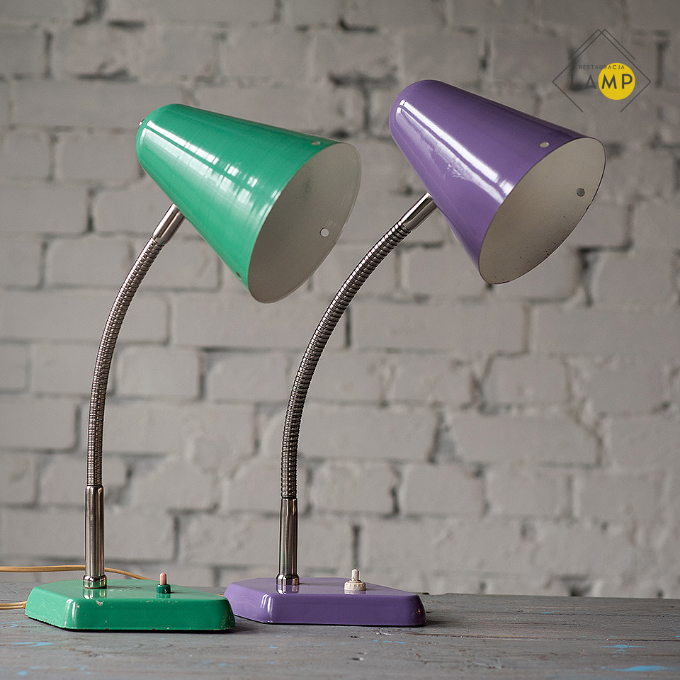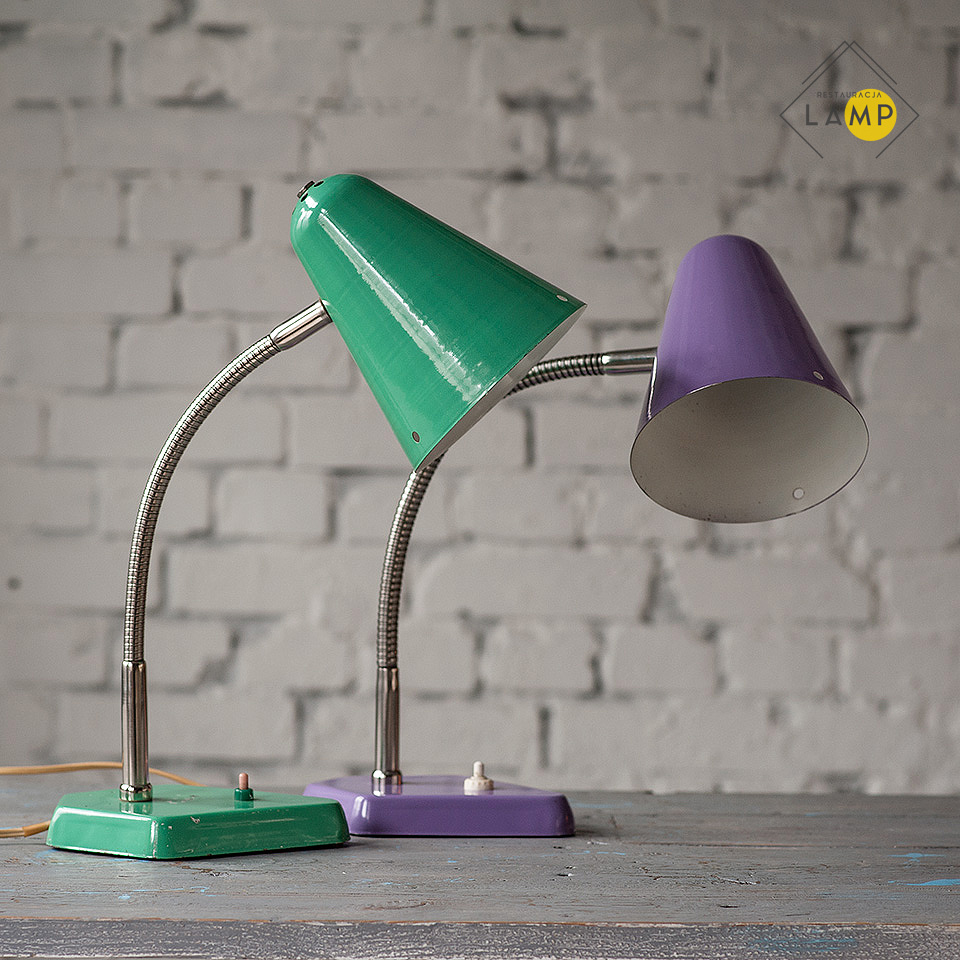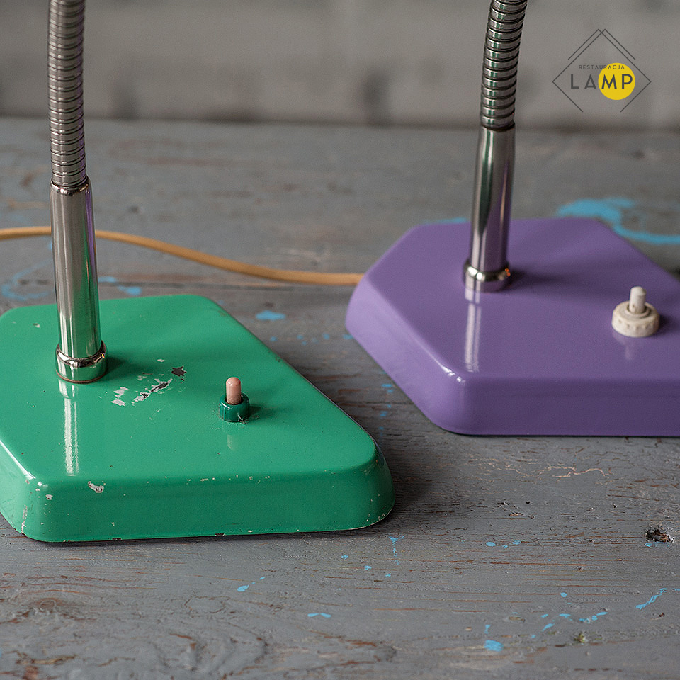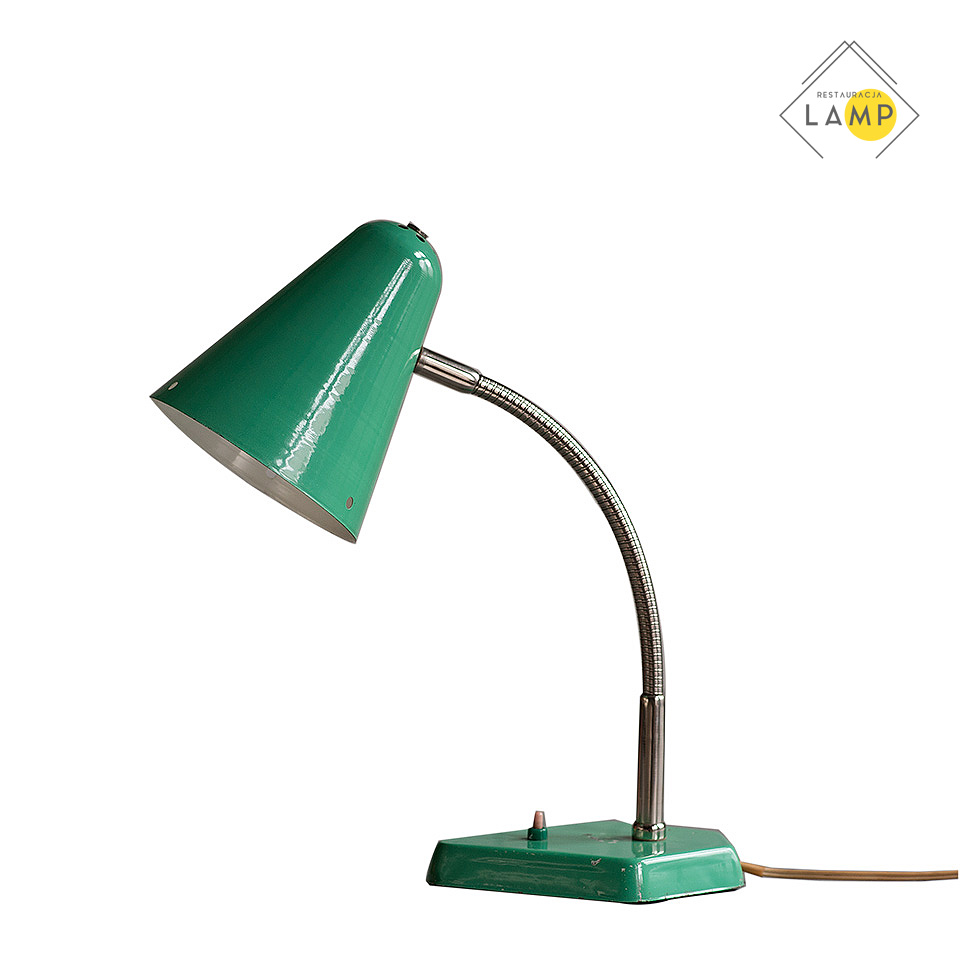 Lampa wężowa na biurko wyprodukowana w Polsce w latach 60-tych w zakładach Polam Wilkasy. Posiadamy 2 identyczne modele różniące się kolorem i włącznikiem. Konstrukcja oparta jest na wężowym ramieniu dzięki czemu swobodnie można regulować ustawienie klosza. Na spodzie lampy widoczne są informacje podające sygnaturę modelu i logo producenta — A23, czyli nazwę zakłądu Mazurskich Zakładów Aparatury Oświetleniowej w Wilkasy/ k Giżycka. Powierzchnia lampy zielonej posiada niewielkie zadrapania na powierzchni. Żaden z elementów lamp nie został przez nas zmieniony. Renowacja lamp polegała na dokładnym ich wypolerowaniu