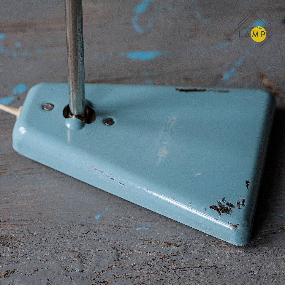 Lampa jest regulowana przy kloszu oraz przy podstawie w jednej płaszczyźnie. Na powierzchni widoczne są lekkie zadrapania. Włącznik znajduje się na przewodzie. W ramach renowacji lampa została oczyszczona, a elementy chromowane zostały wypolerowane. Przewód jest oryginalny.